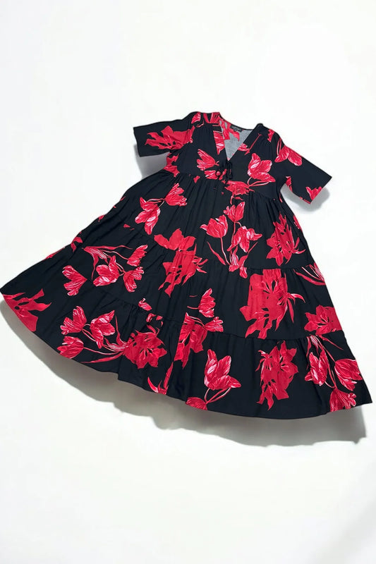 Maxikleid mit rotem Blumenprint – Viskose-Traum von Vincenzo Allocca 44 46 48 50 52 54 56 58 60 62