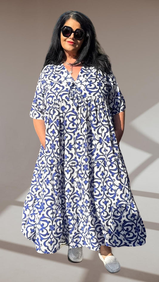 Vincenzo Allocca Maxikleid blau-weiß – luftiger Sommertraum 44 46 48 50 52 54 56 58 60 62