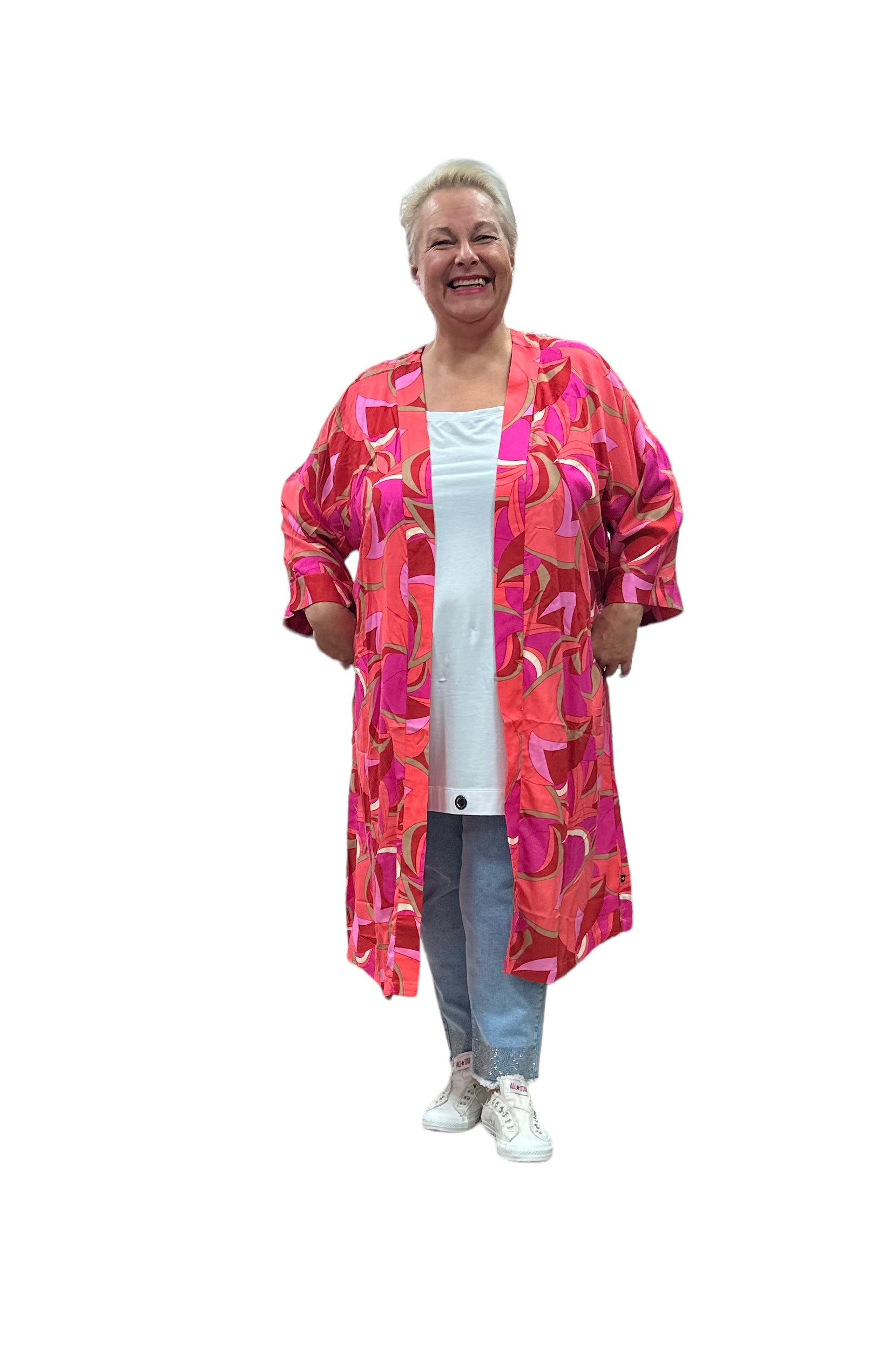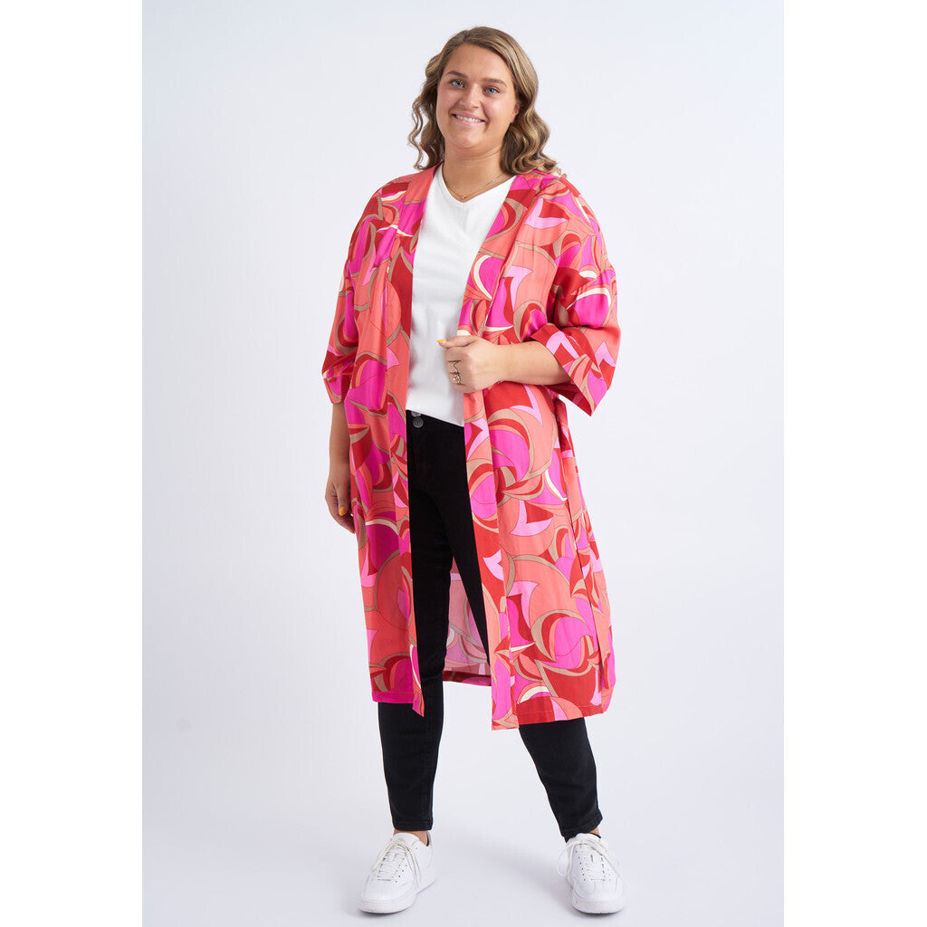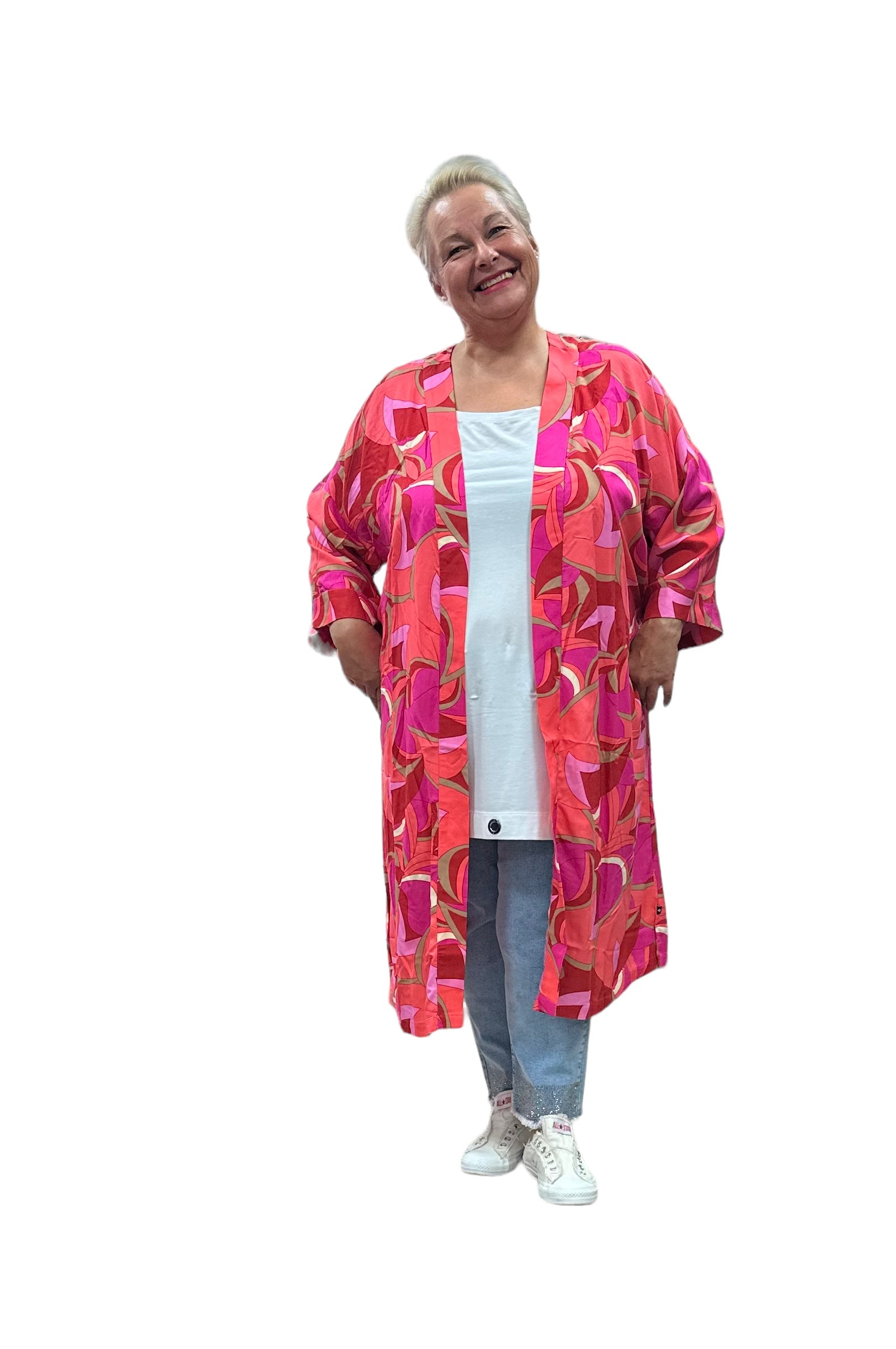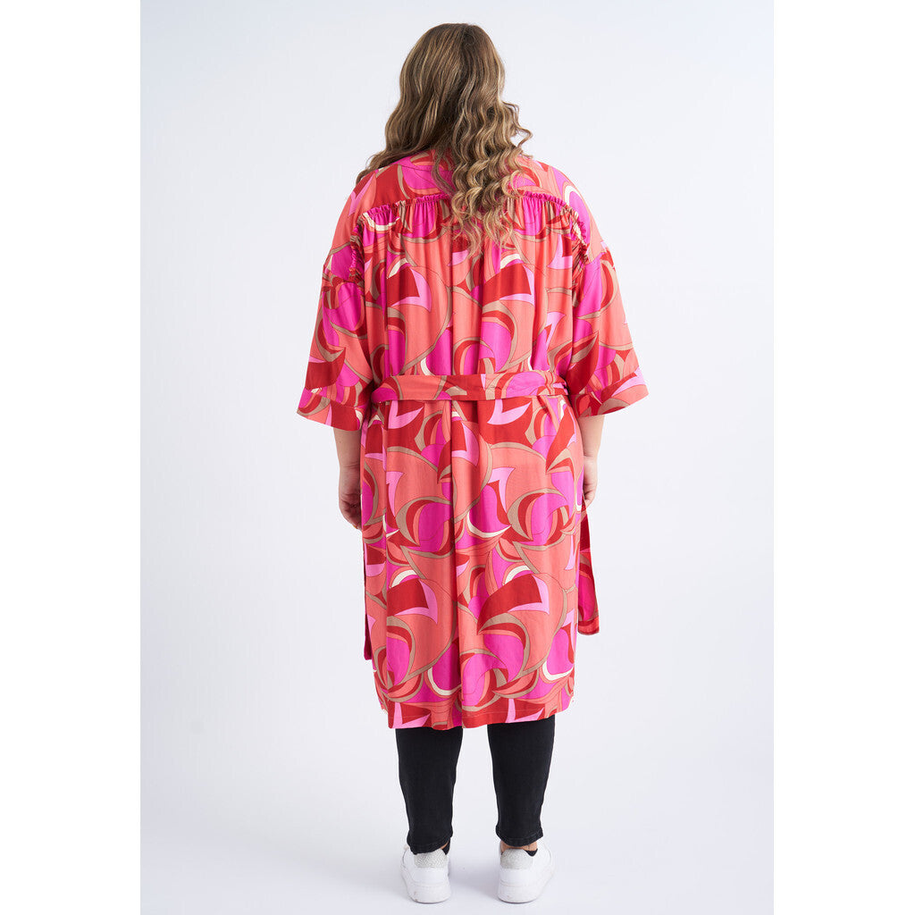 Erregen Sie Aufmerksamkeit mit diesem farbenfrohen Kimono, der Rosa- und Orangetöne in einem auffälligen Muster vereint. Dieser Kimono ist mit seinem leichten Stoff und dem fließenden Design das perfekte Layering-Teil für Ihre Garderobe und lässt sich problemlos über figurbetonten Kleidern oder einem einfachen Oberteil und Jeans tragen. Die offene Vorderseite und der breite Gürtel ermöglichen ein vielseitiges Styling, während die kurzen Ärmel es ideal für wärmere Tage machen.
