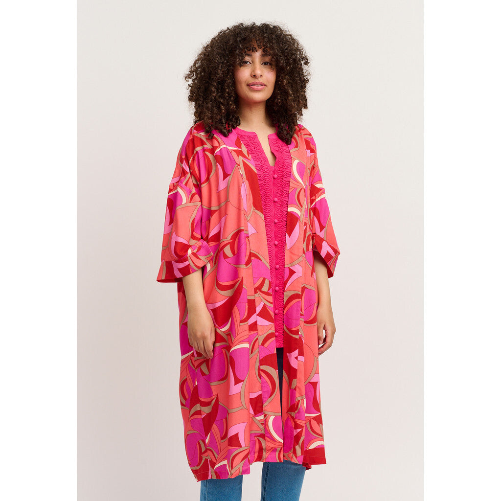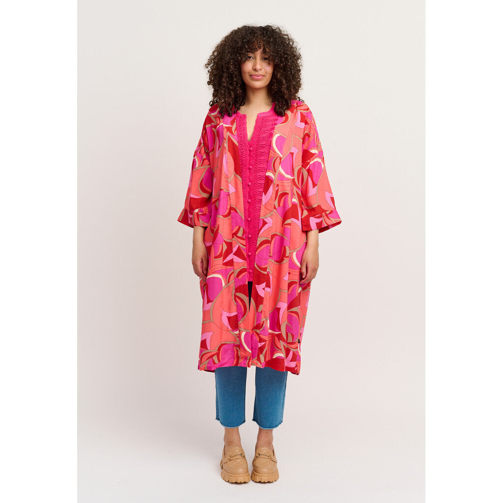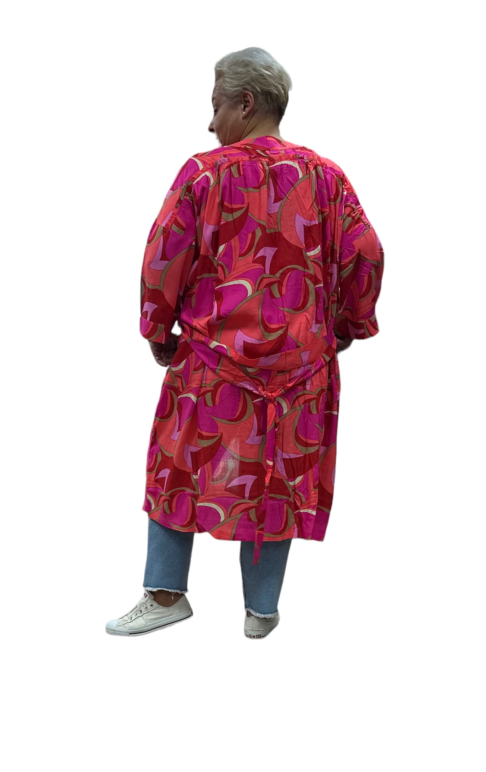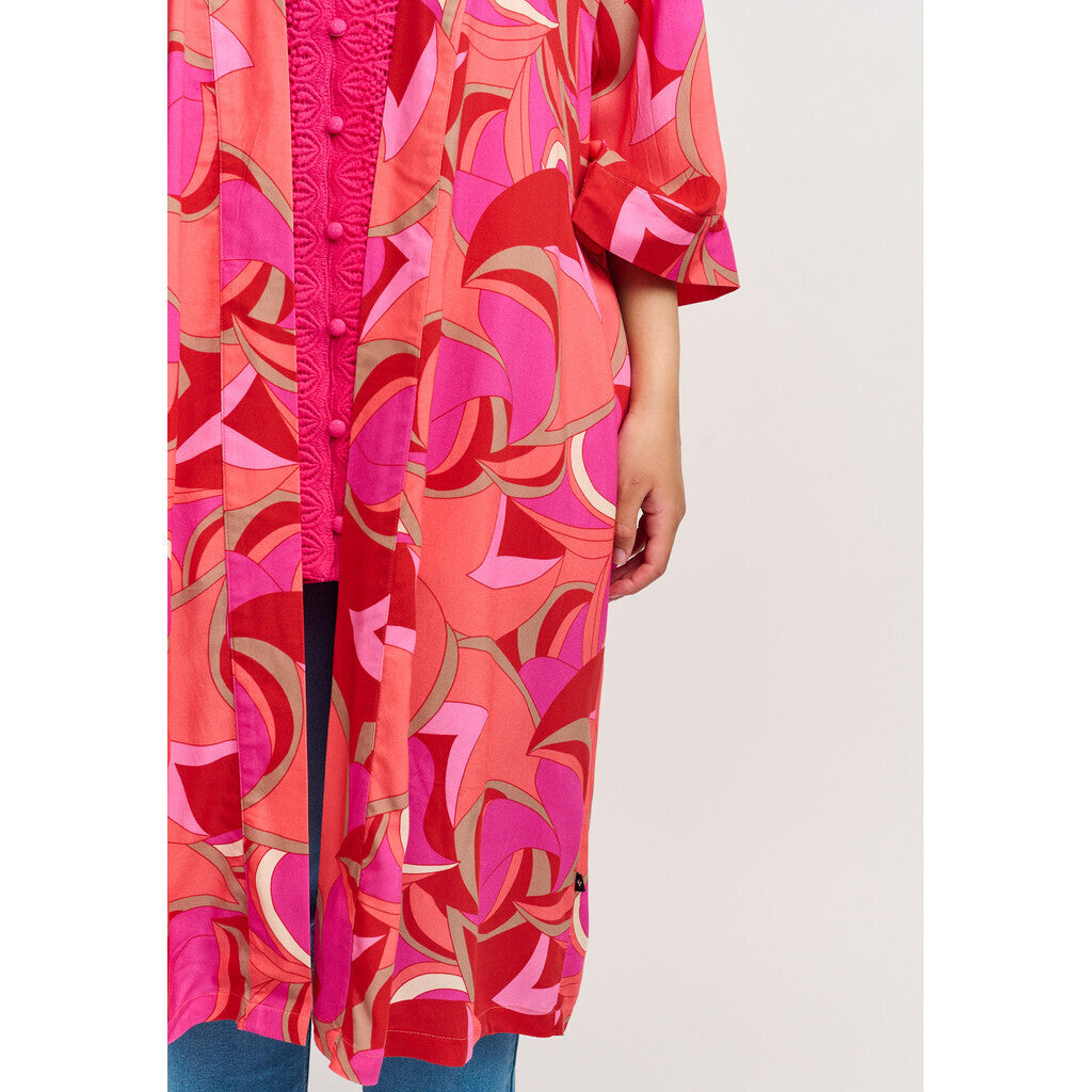 Erregen Sie Aufmerksamkeit mit diesem farbenfrohen Kimono, der Rosa- und Orangetöne in einem auffälligen Muster vereint. Dieser Kimono ist mit seinem leichten Stoff und dem fließenden Design das perfekte Layering-Teil für Ihre Garderobe und lässt sich problemlos über figurbetonten Kleidern oder einem einfachen Oberteil und Jeans tragen. Die offene Vorderseite und der breite Gürtel ermöglichen ein vielseitiges Styling, während die kurzen Ärmel es ideal für wärmere Tage machen.