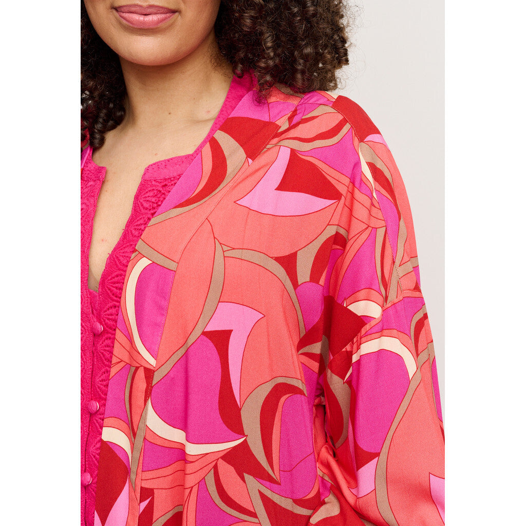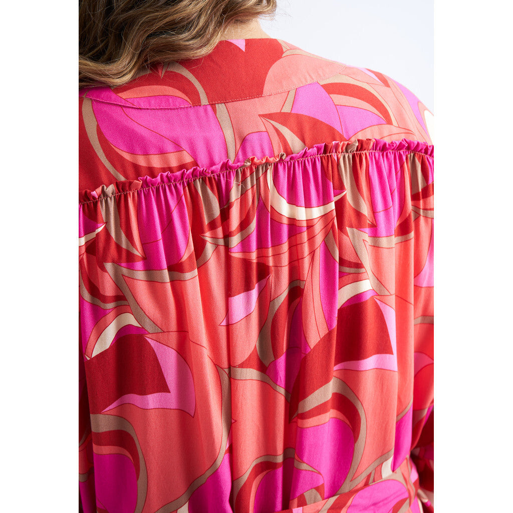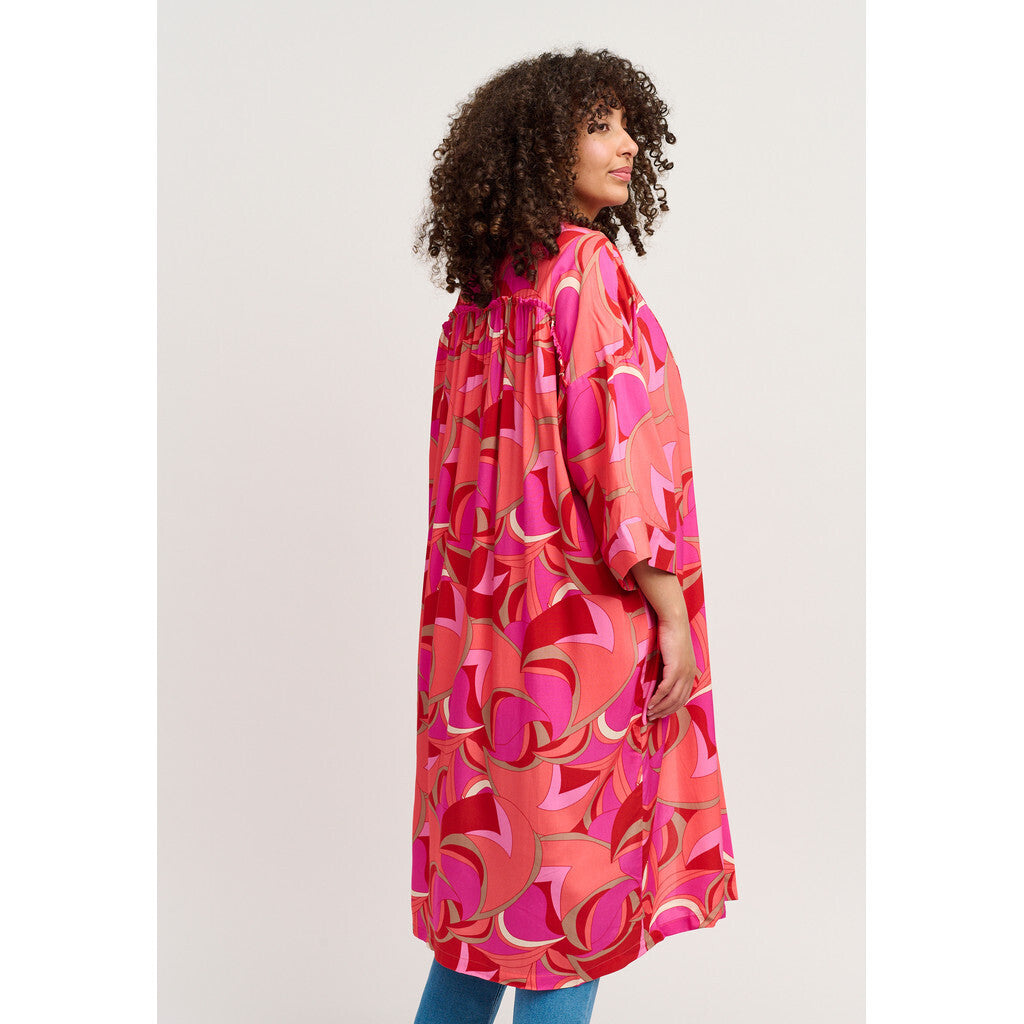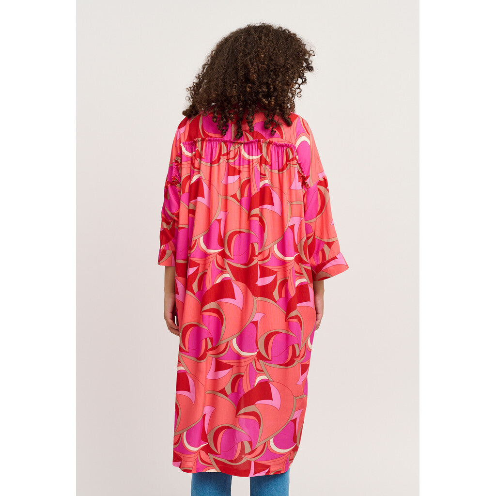 Erregen Sie Aufmerksamkeit mit diesem farbenfrohen Kimono, der Rosa- und Orangetöne in einem auffälligen Muster vereint. Dieser Kimono ist mit seinem leichten Stoff und dem fließenden Design das perfekte Layering-Teil für Ihre Garderobe und lässt sich problemlos über figurbetonten Kleidern oder einem einfachen Oberteil und Jeans tragen. Die offene Vorderseite und der breite Gürtel ermöglichen ein vielseitiges Styling, während die kurzen Ärmel es ideal für wärmere Tage machen.