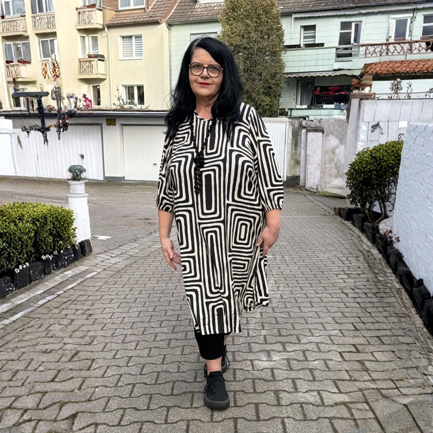 Das grafische Muster in Schwarz-Creme wirkt klar und edel, bleibt aber absolut alltagstauglich. Du kannst es ruhig sportlich tragen oder mit wenigen Handgriffen in eine schicke Linie bringen. Und das Beste: Es ist ein Kleid, das im Koffer kaum Platz nimmt – und am Körper einfach „nichts wiegt“.