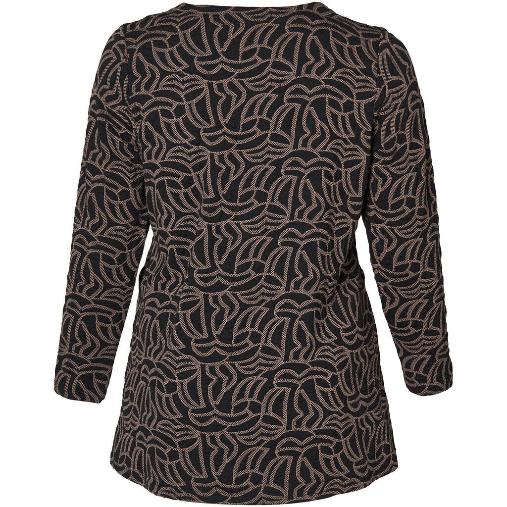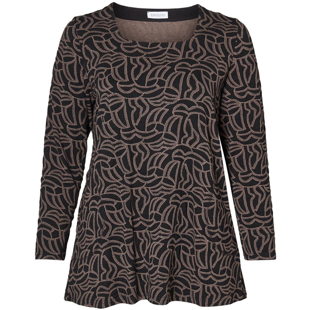 Diese elegante Shirt-Tunika von Chalou in A-Form beeindruckt mit ihrem modischen Carree-Ausschnitt und einem gewebten Muster in edlem Taupe auf schwarzer Grundfarbe.