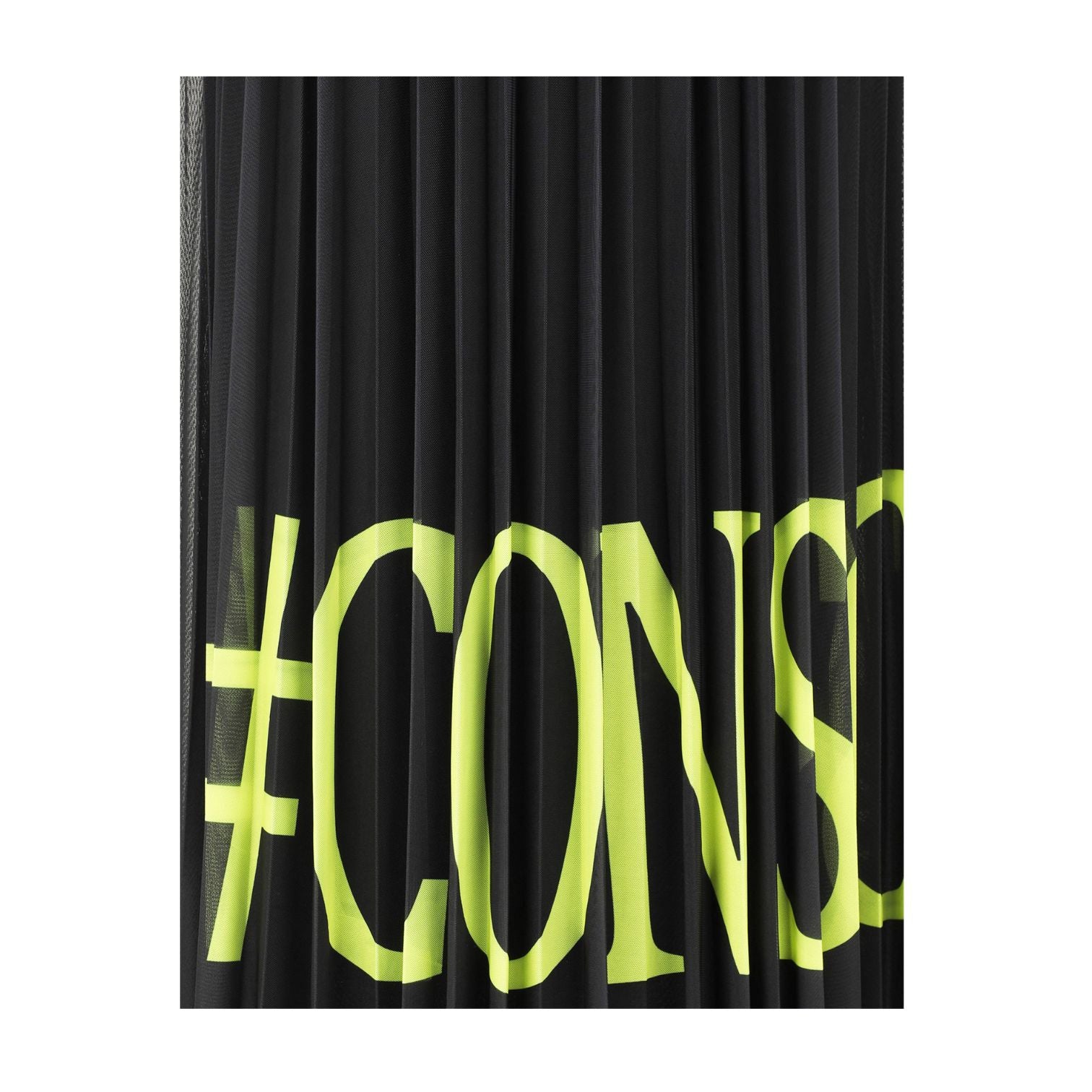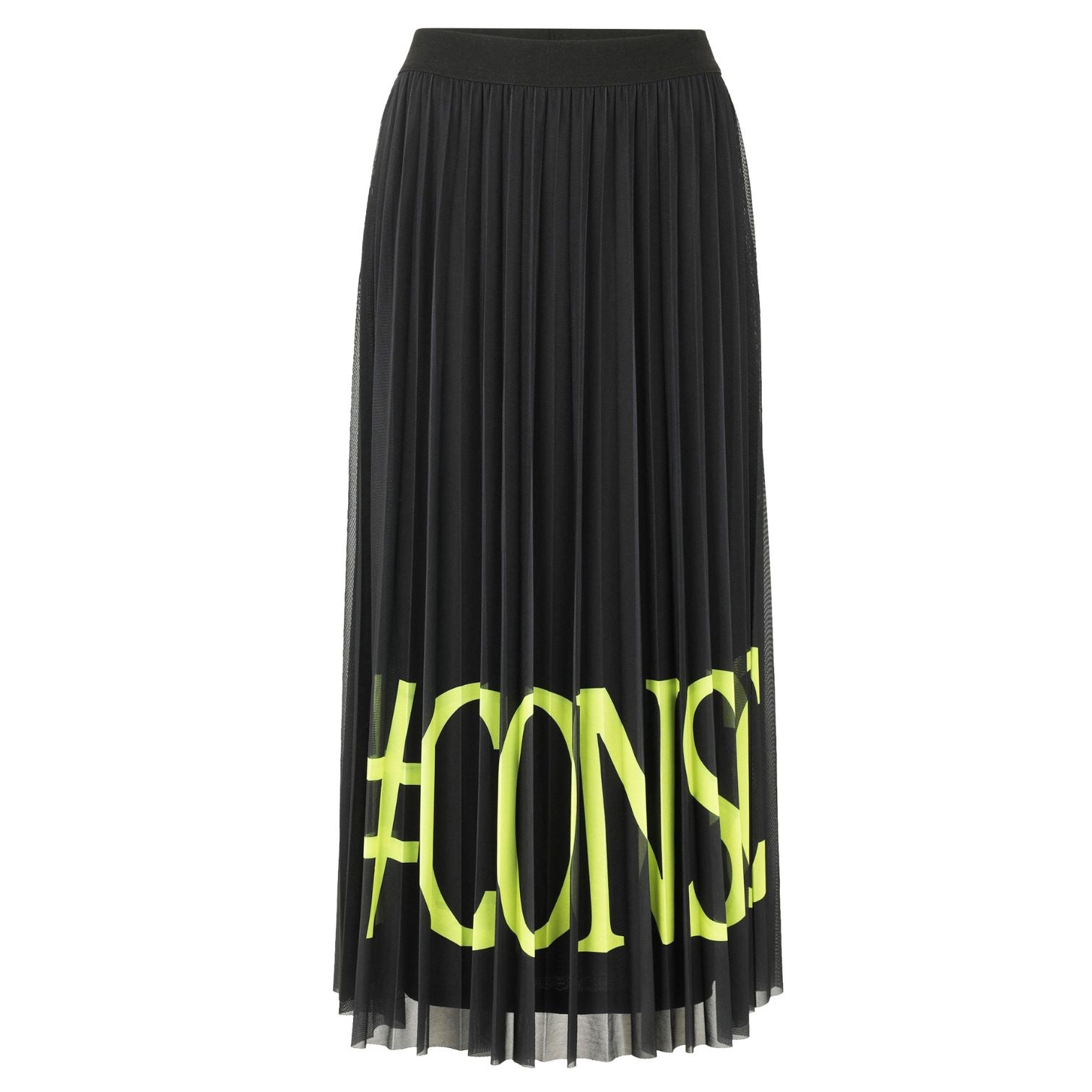 Dieser Plisseerock wirkt ruhig und modern zugleich und begleitet uns mühelos durch den Alltag. Der schwarze Grundton bildet eine schöne, klare Basis, während der neonfarbene Schriftzug am Saum gezielt Akzente setzt und dem Look eine zeitgemäße Spannung verleiht.