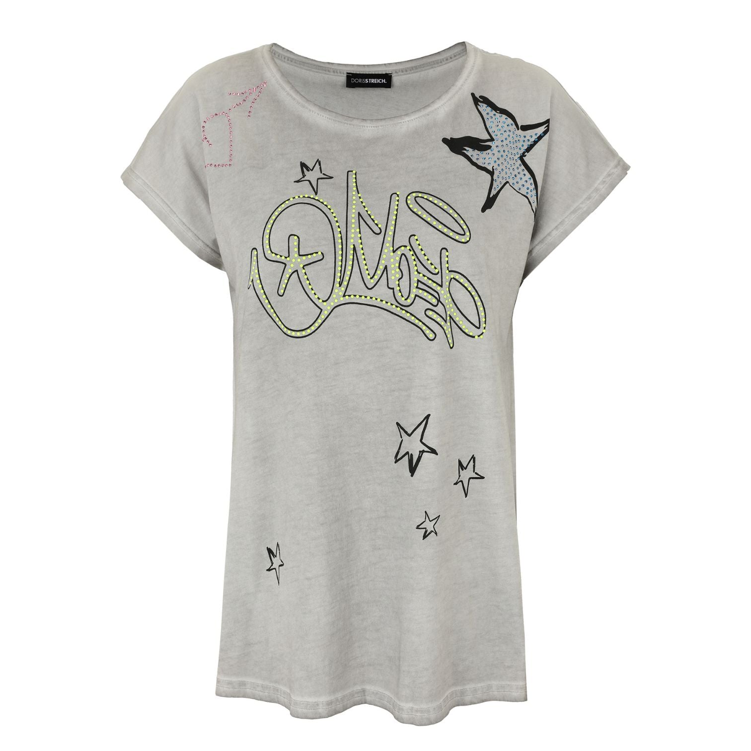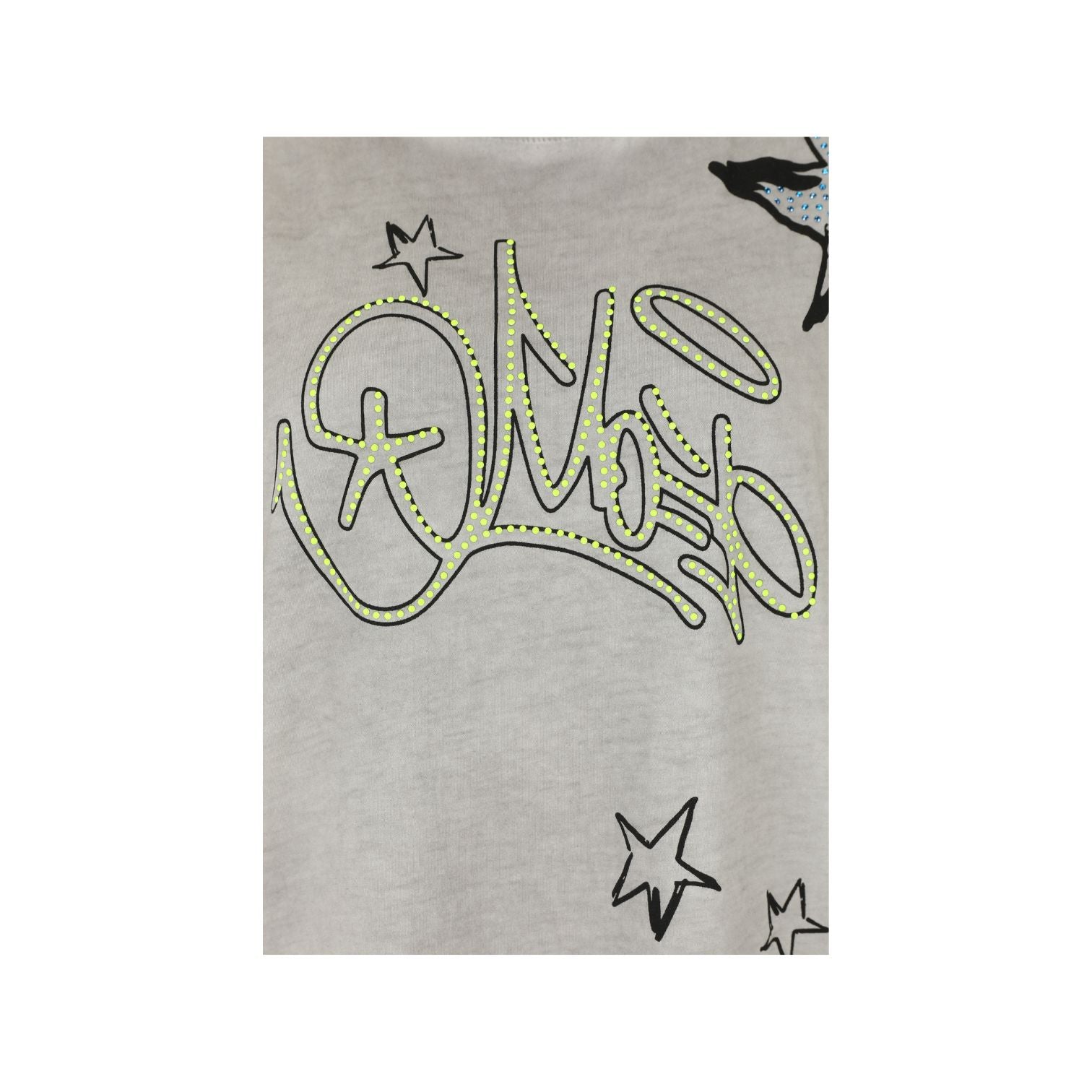 Das Graffiti-Motiv mit feinen Plättchen setzt einen besonderen Akzent und fällt ins Auge, ohne laut zu wirken. Sterne und grafische Details lockern den Look auf und geben dem Shirt eine lässige, kreative Note. Durch die überschnittenen Schultern und den angeschnittenen Arm fällt es locker und umspielt die Figur sanft.