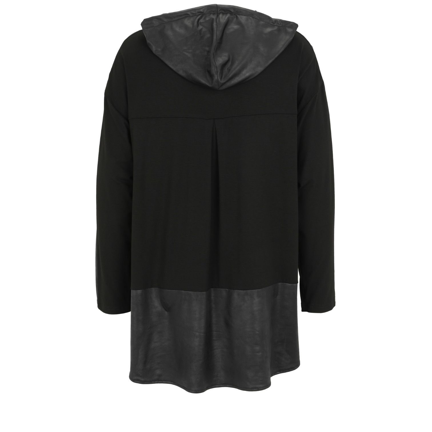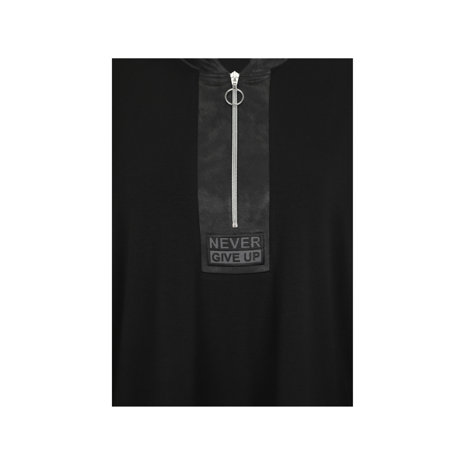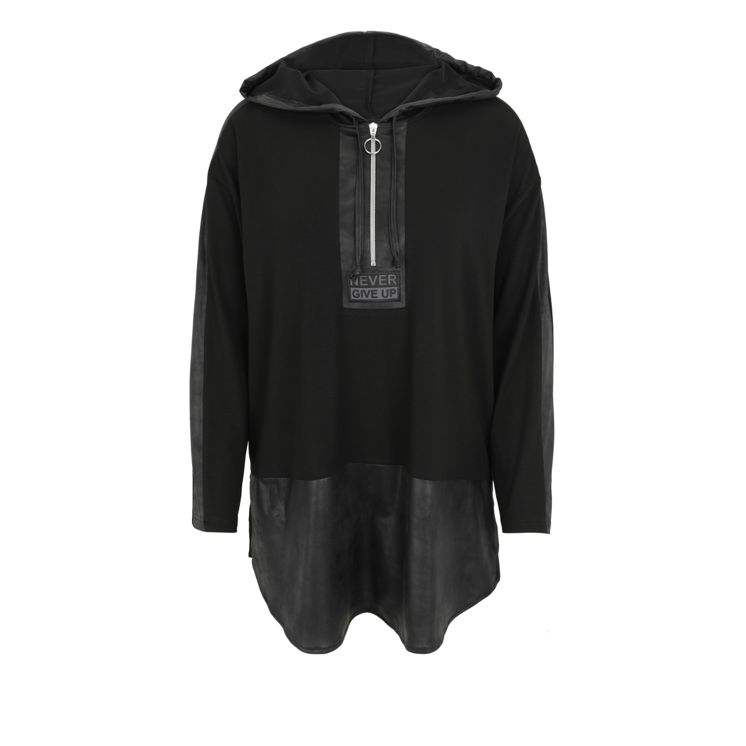 Ein ausdrucksstarker Look von Doris Streich! Diese schwarze Tunika besticht durch raffinierte Details in Lederoptik. Der Reißverschluss mit Rundzipp, die seitlichen Einsätze an den Ärmeln sowie der Saumabschluss aus Kunstleder verleihen dem Modell eine moderne, urbane Note.