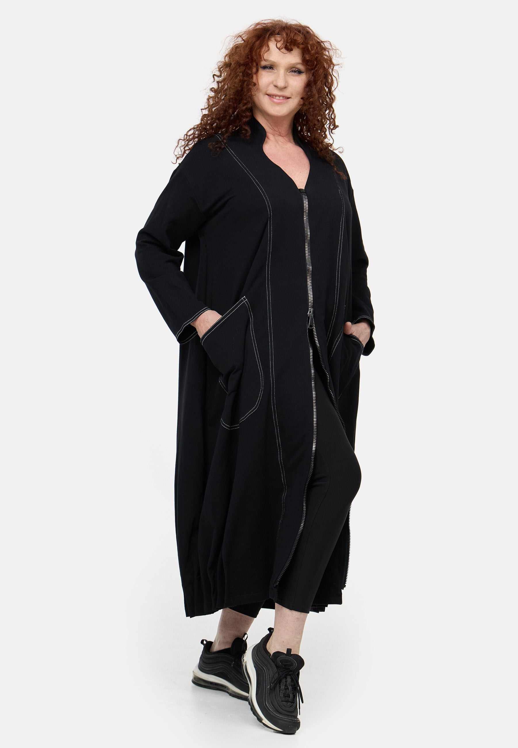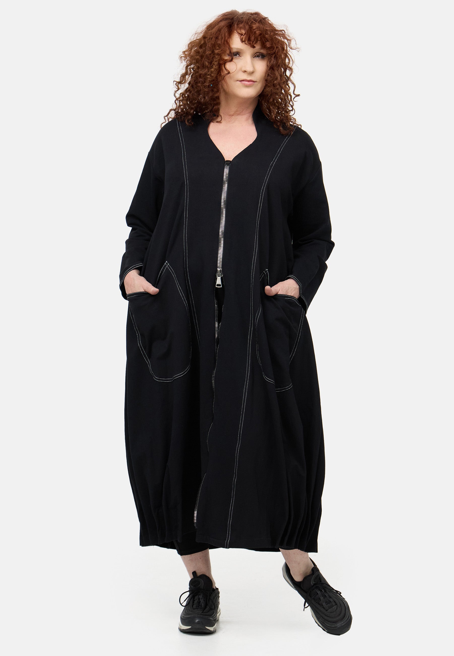 Der Mantel ist in edlem Schwarz gehalten und verfügt über elegante weiße Garn-Akzente, die ihm einen modernen Touch verleihen. Die praktischen Eingriffstaschen und der Reißverschluss sorgen für Funktionalität und Style zugleich, während die Gimmicks am Saum für eine zusätzliche Portion Raffinesse sorgen.