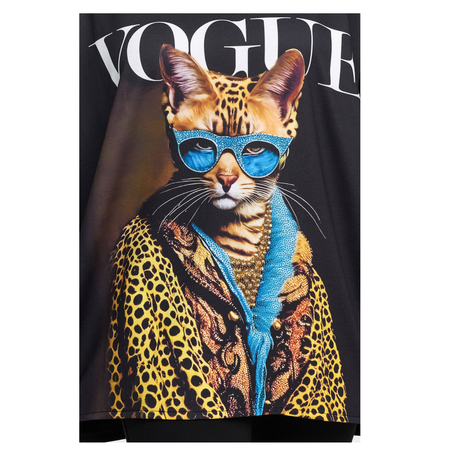 Dieses extravagante Shirt von Frenzi4U zieht alle Blicke auf sich. Der Vorderteil begeistert mit einem auffälligen Porträtmotiv, umrahmt von einem angesagten Leoprint und veredelt mit funkelnden Straß- und Glitzerdetails.