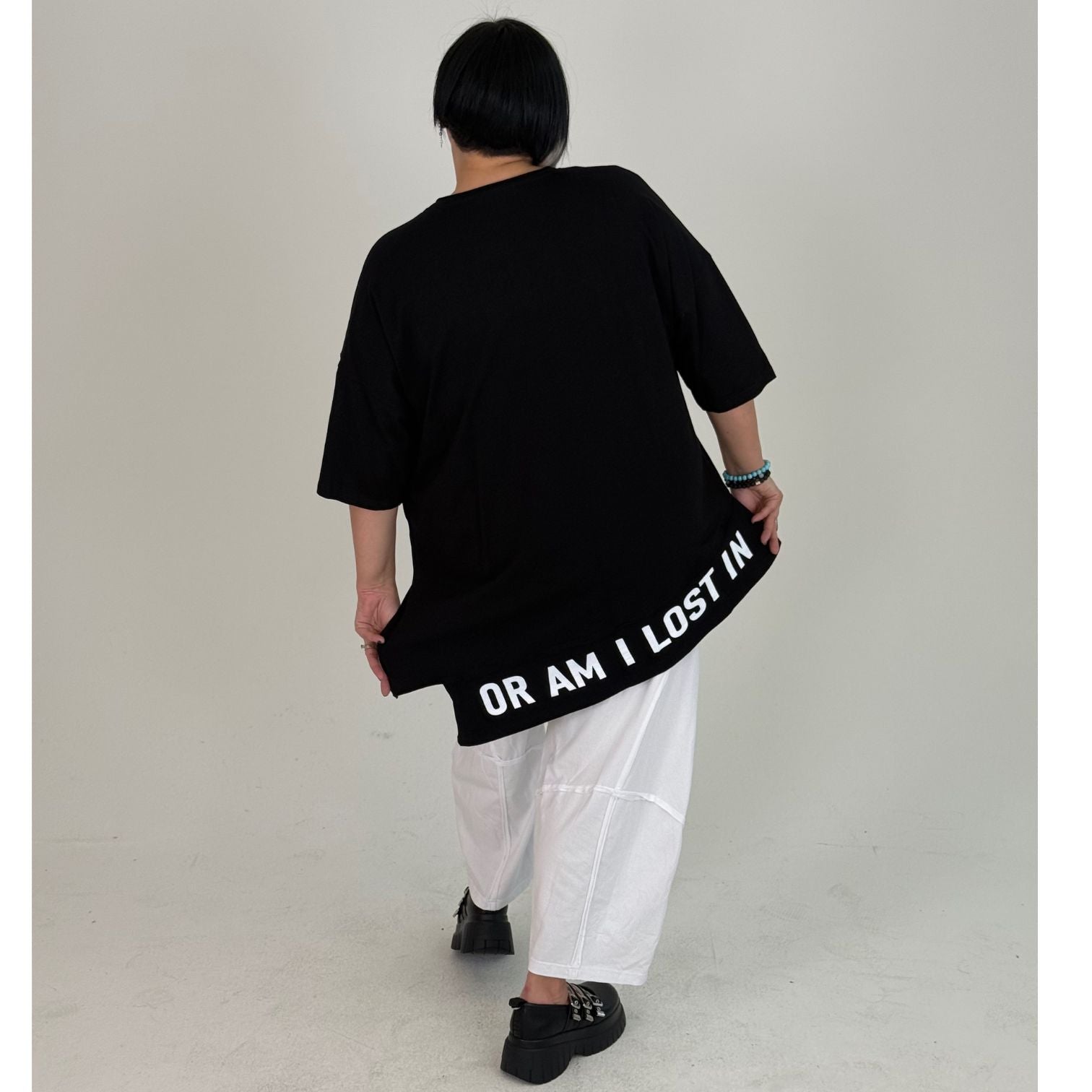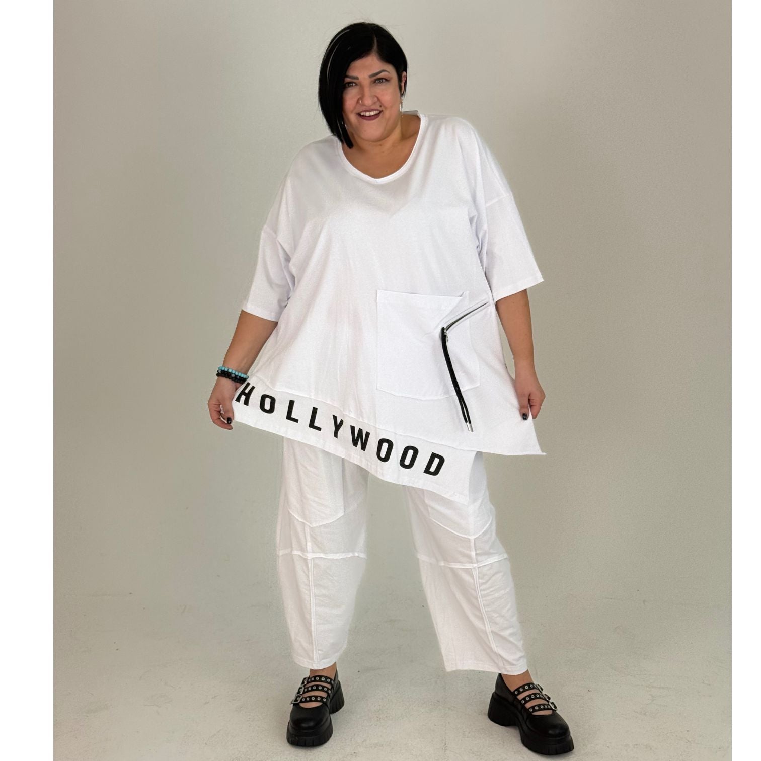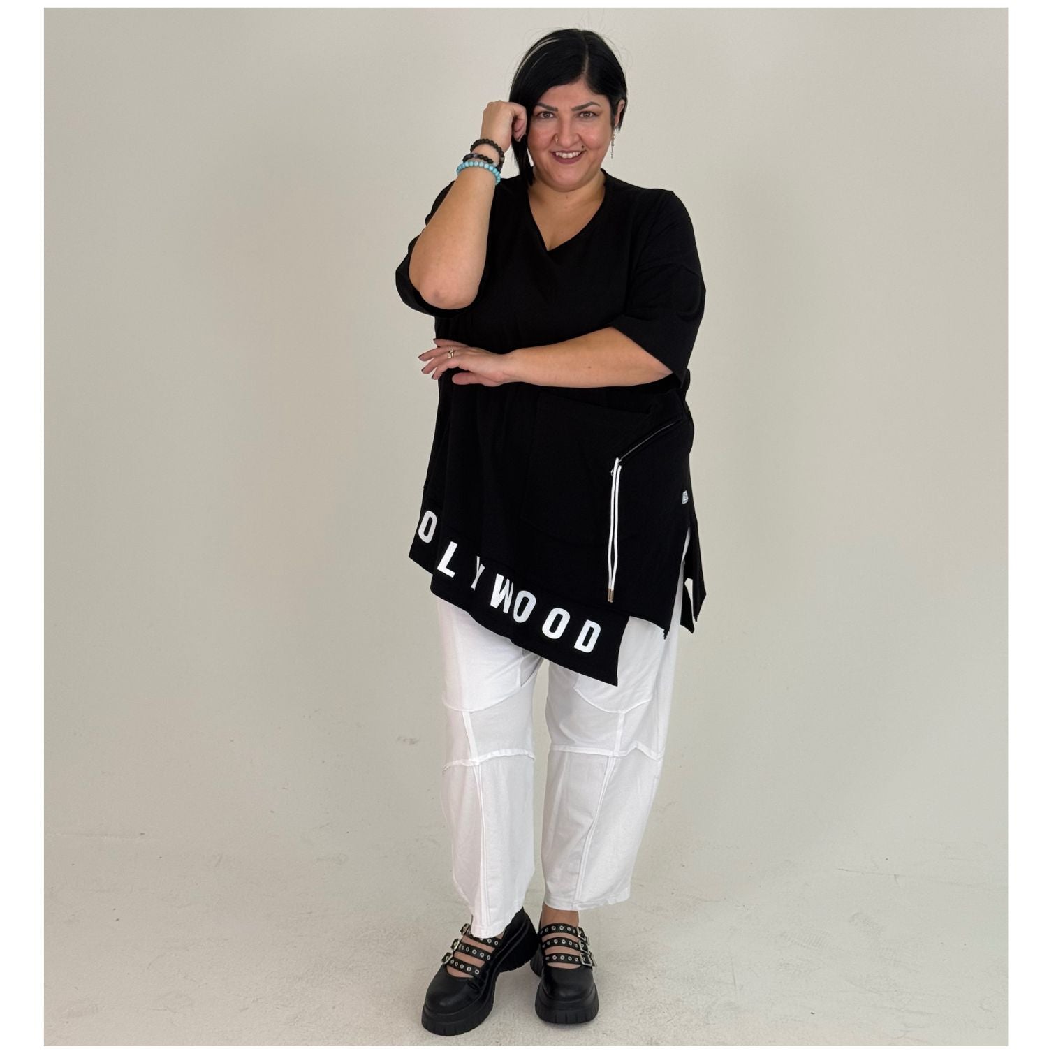 Diese Shirt-Tunika von Sinne by Coom verbindet modernen Komfort mit einer ausdrucksstarken, aber alltagstauglichen Optik. Der asymmetrische Schnitt sorgt für eine besondere Silhouette, während der Frontprint „Hollywood“ und der rückseitige Schriftzug „Or am I lost in“ dem Modell eine individuelle Note verleihen.