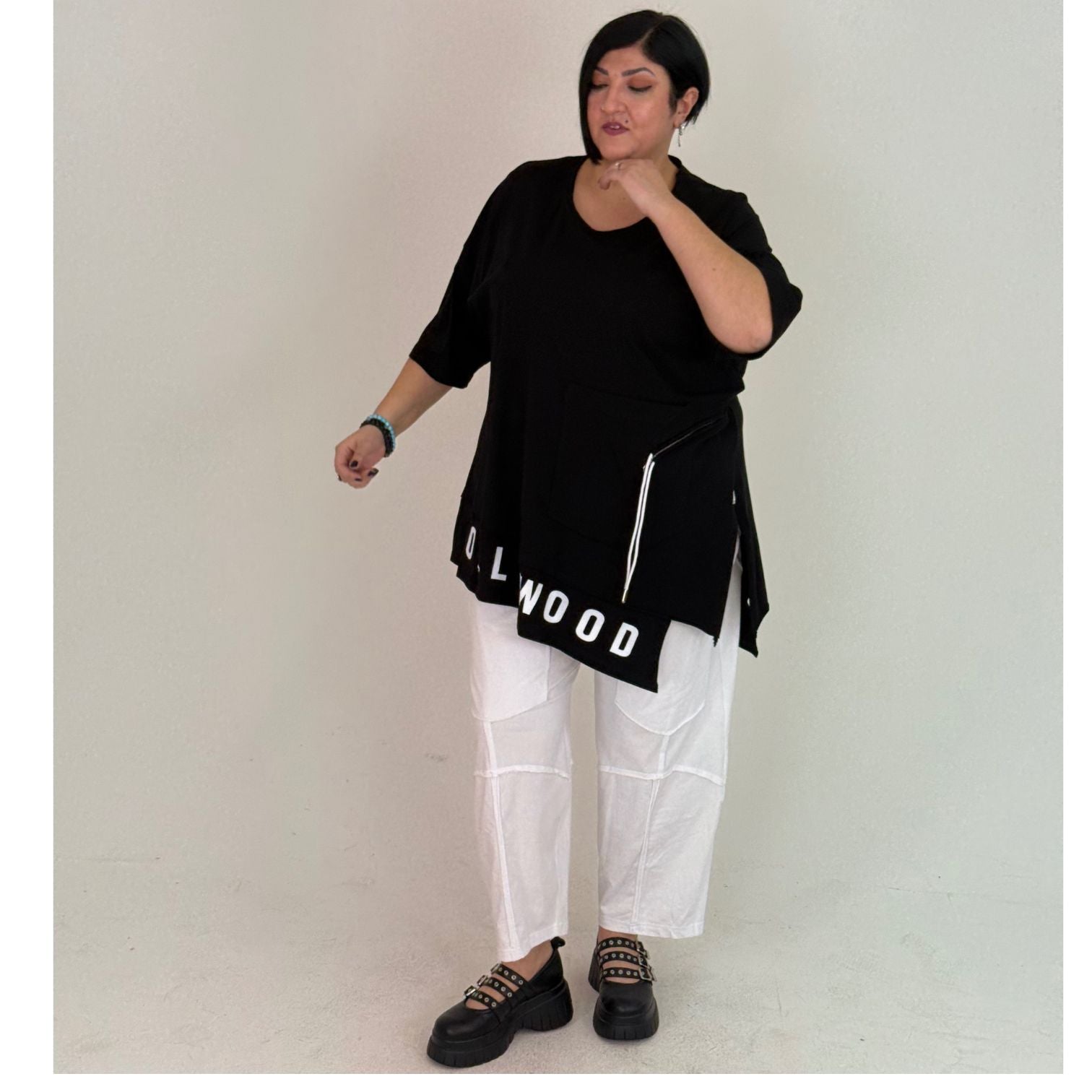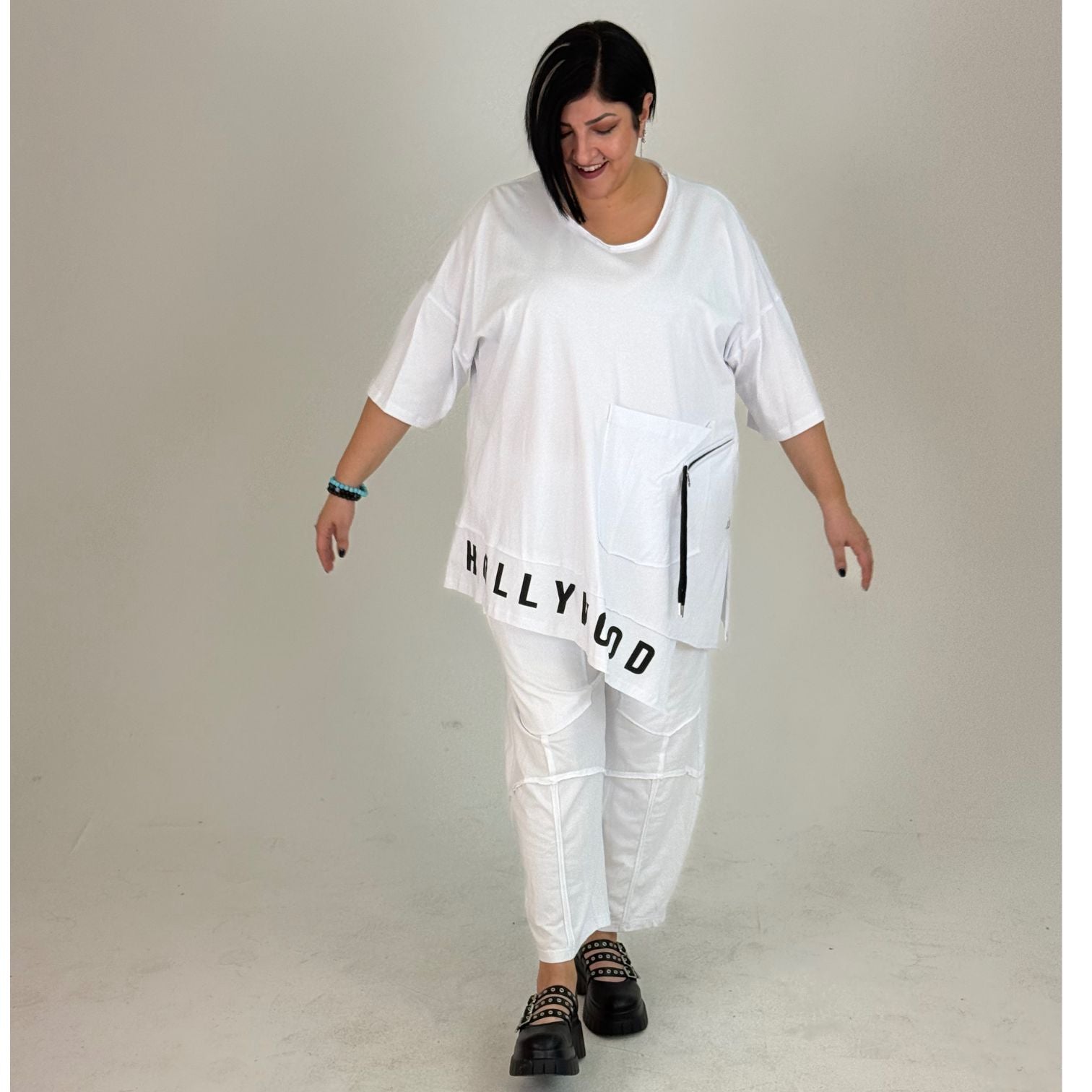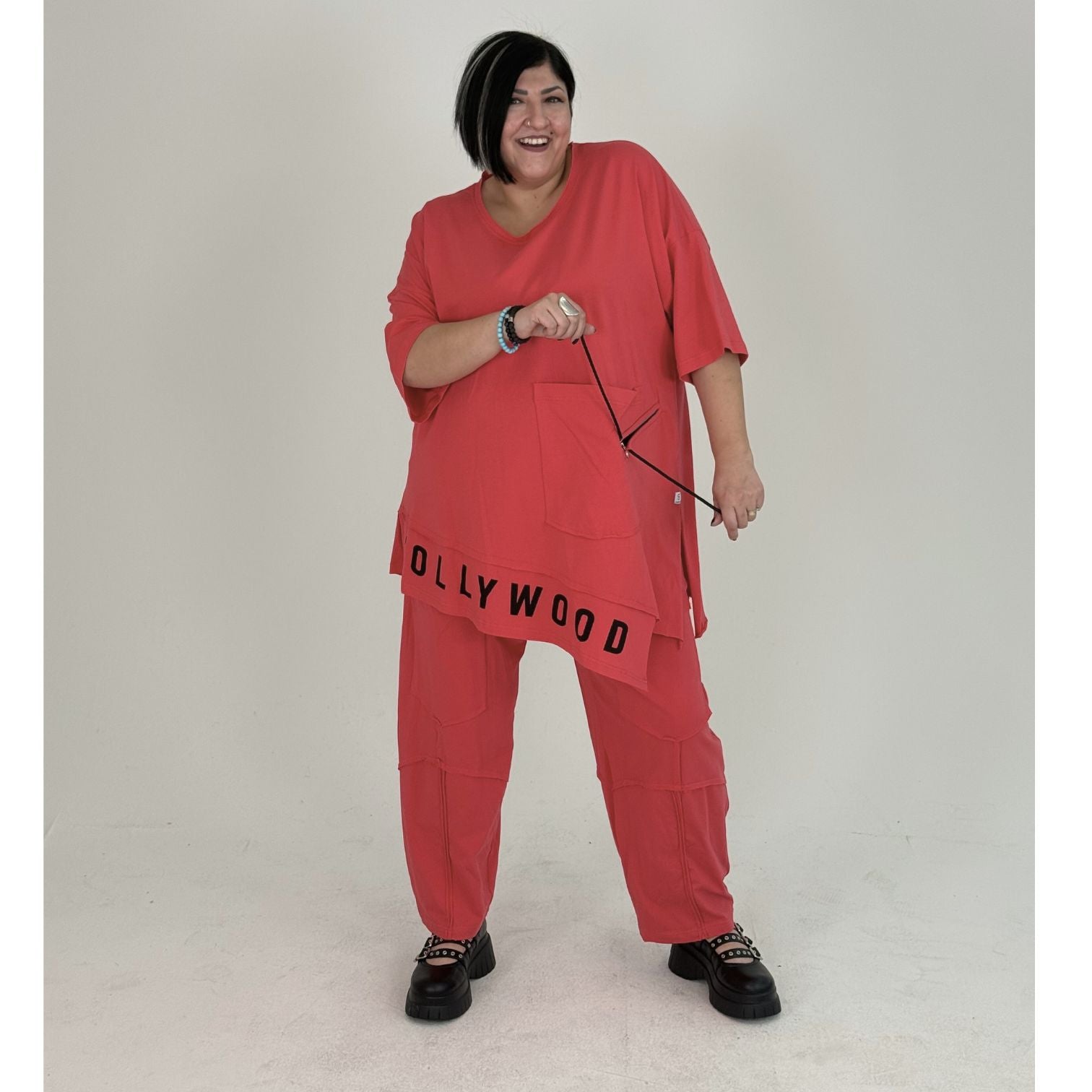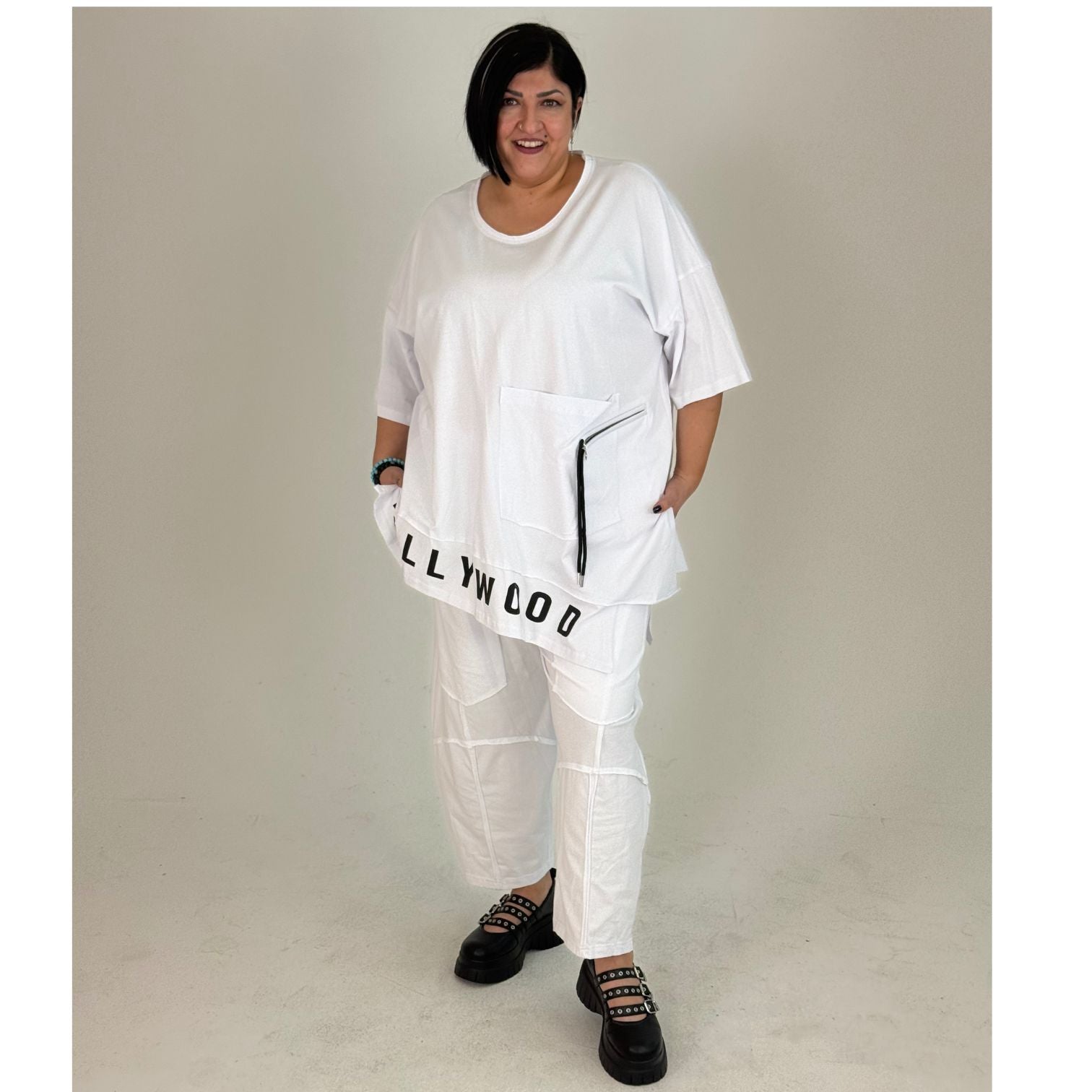 Diese Shirt-Tunika von Sinne by Coom verbindet modernen Komfort mit einer ausdrucksstarken, aber alltagstauglichen Optik. Der asymmetrische Schnitt sorgt für eine besondere Silhouette, während der Frontprint „Hollywood“ und der rückseitige Schriftzug „Or am I lost in“ dem Modell eine individuelle Note verleihen.