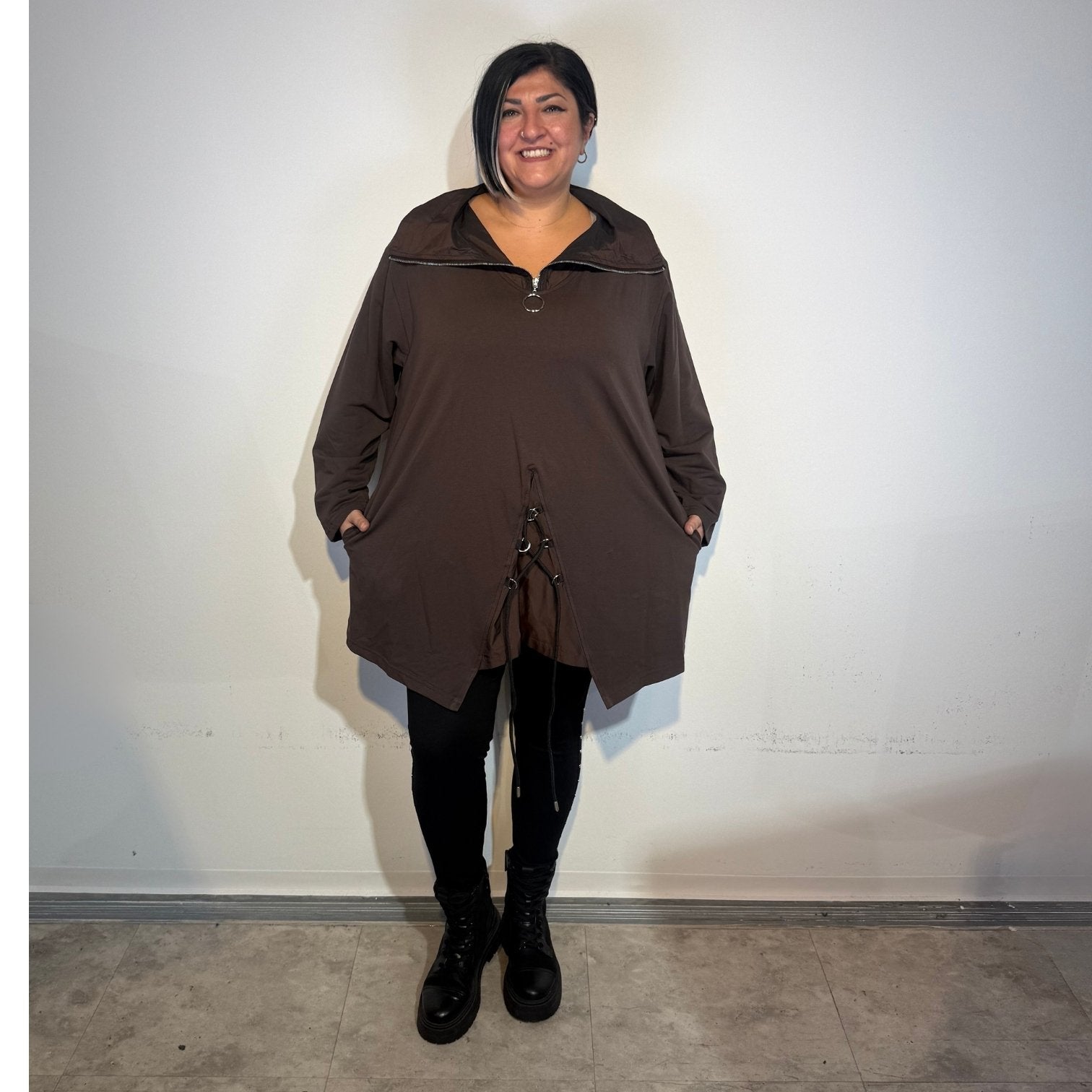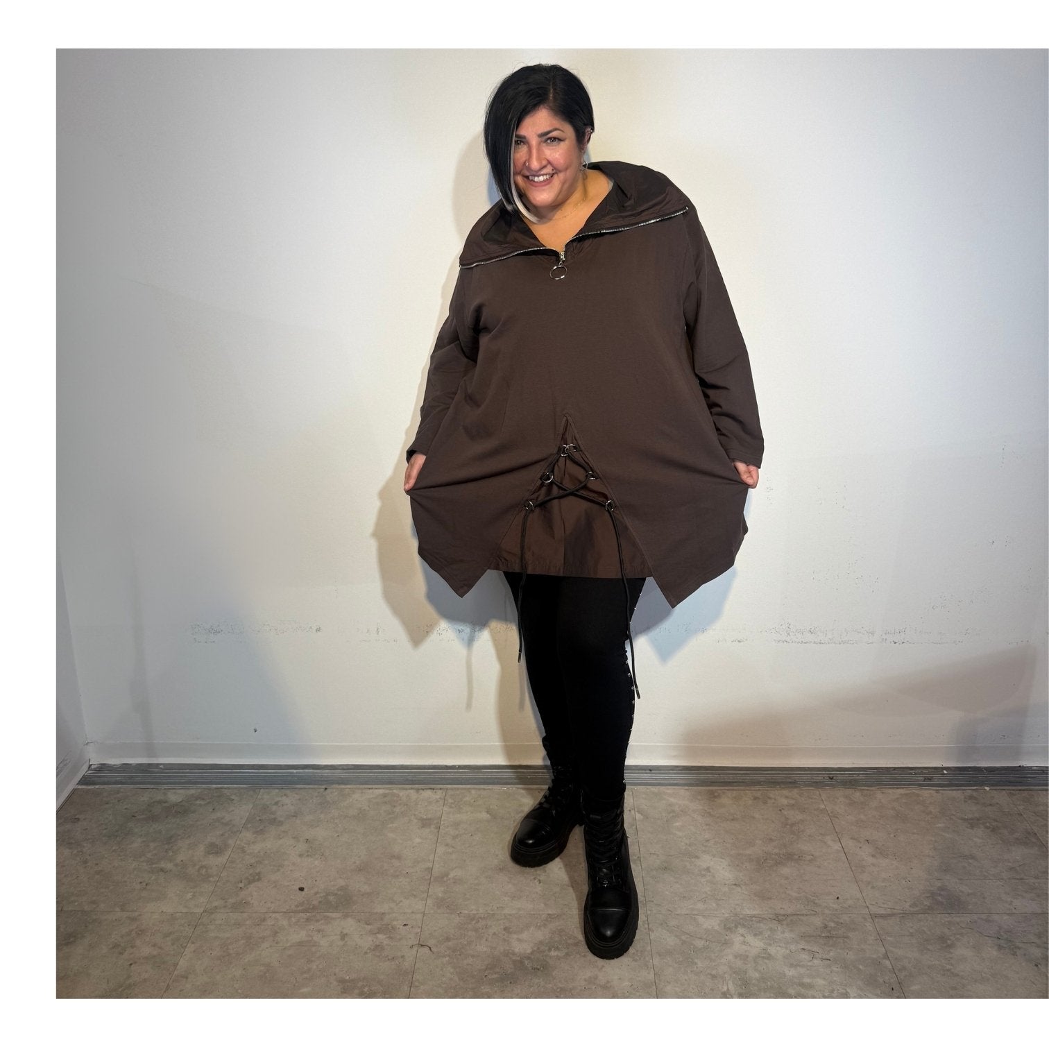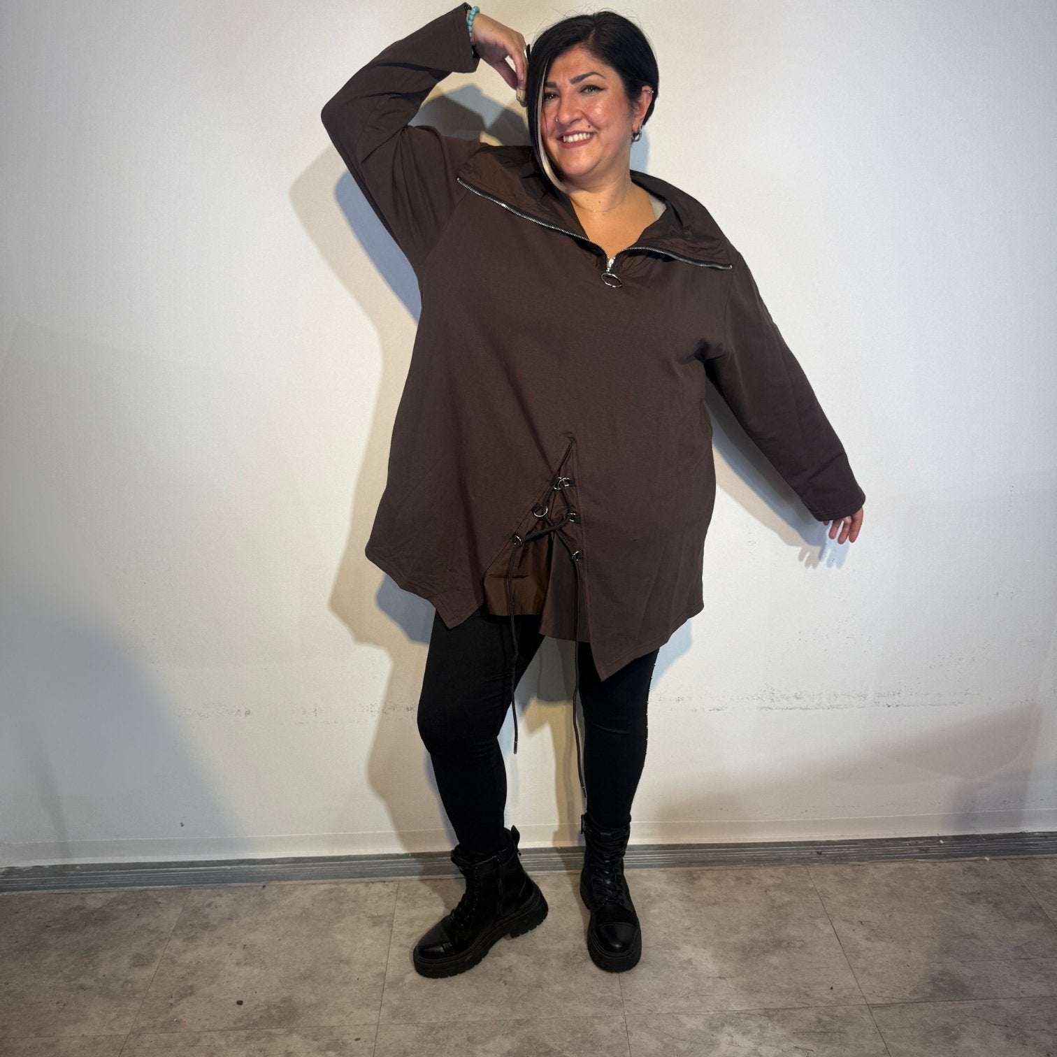 Trage die Tunika zu einer schmalen Lederleggings oder einer schwarzen Stretchhose – mit Boots oder Sneakern entsteht ein moderner Look, der Komfort und Stil perfekt verbindet.