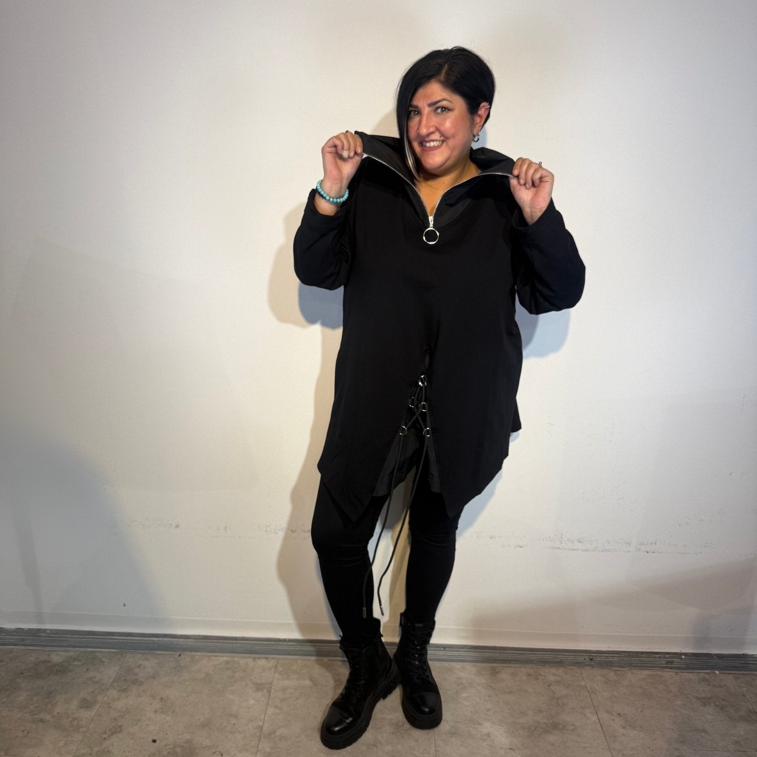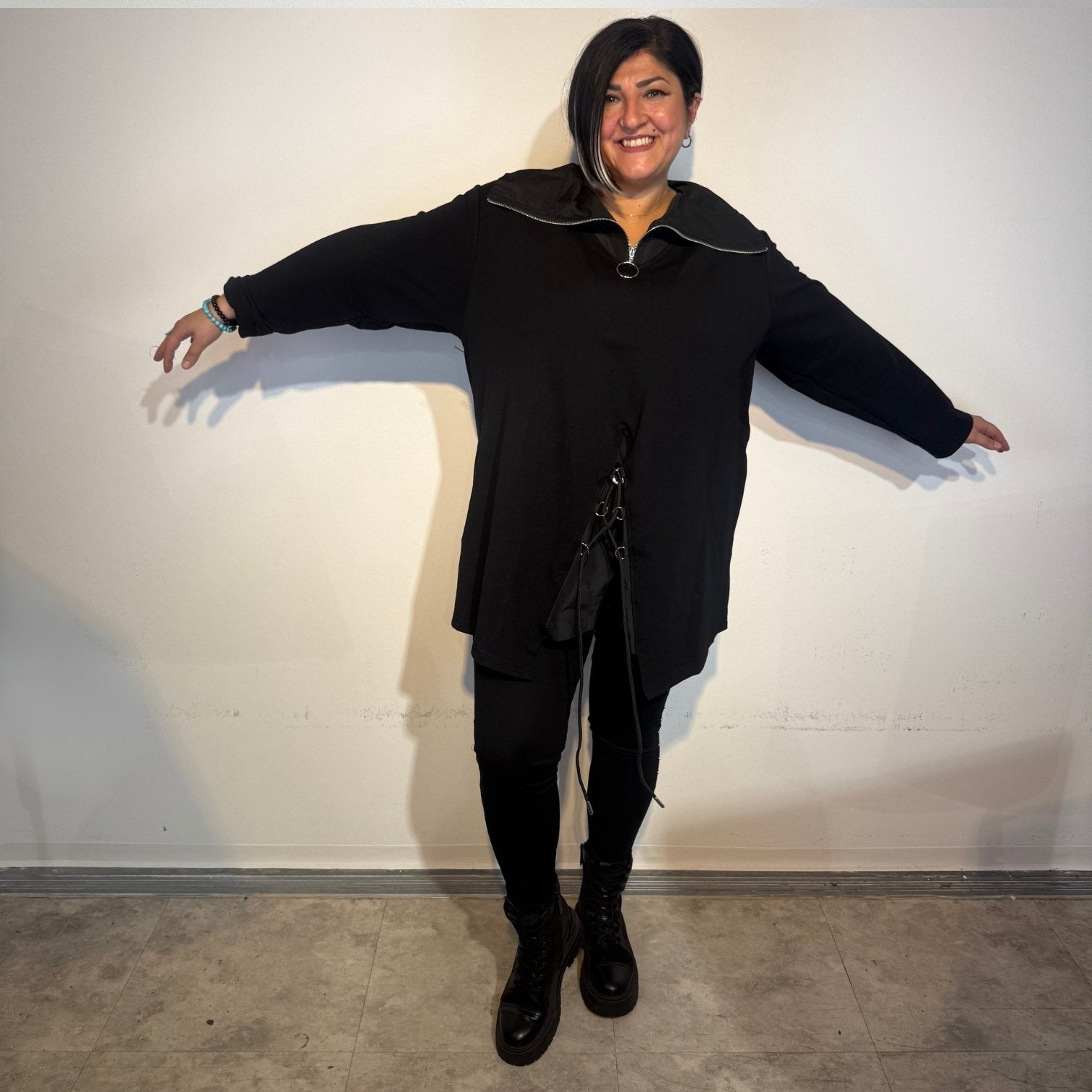 Kombiniere die schwarze Tunika mit einer glänzenden Leggings oder einer Jeans und coolen Boots – so entsteht ein edler, urbaner Look mit Wohlfühlgarantie.