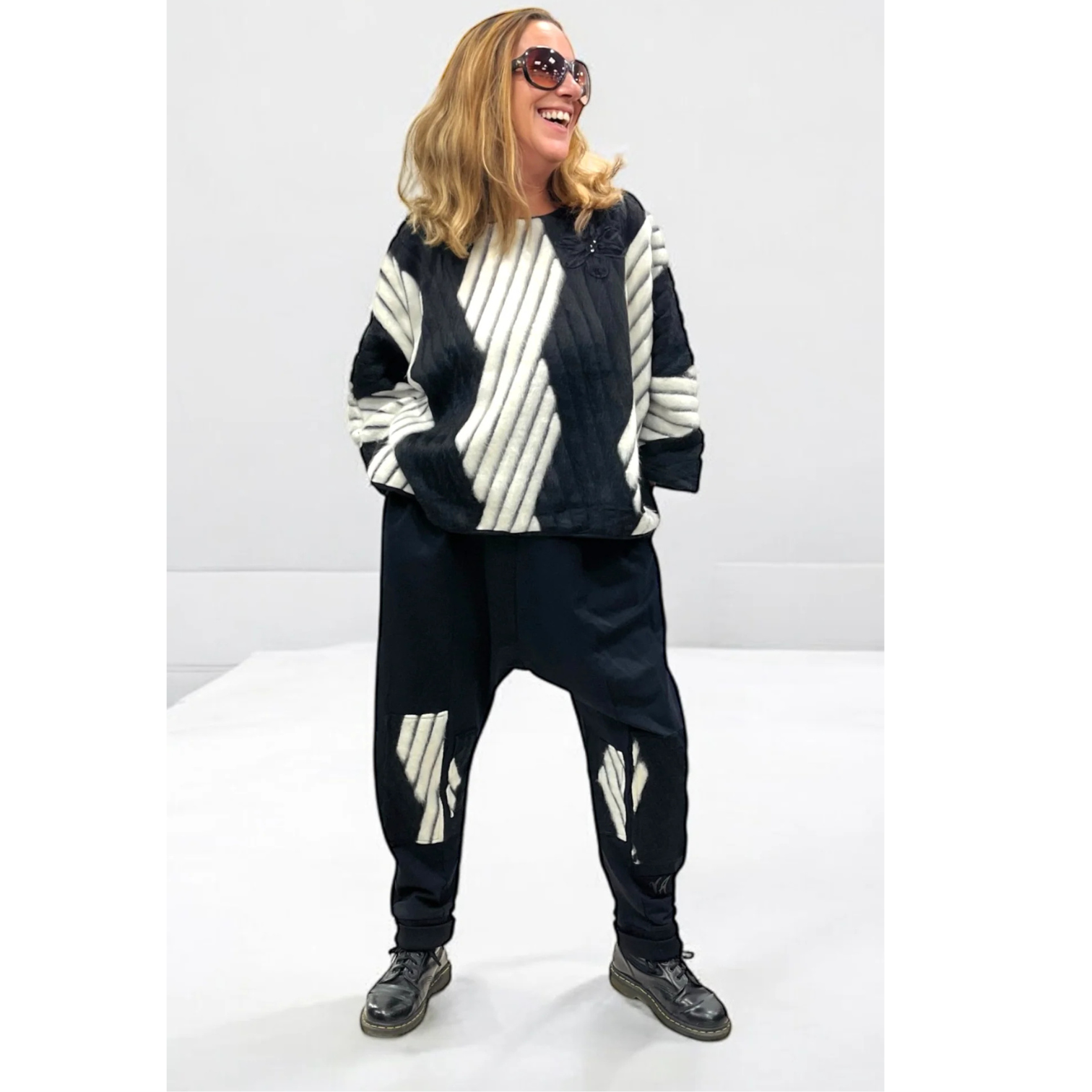 Trendige Hose im modernen Oversize-Look – perfekt für die kühleren Tage! Diese stylische Hose von Vincenzo Alloccaüberzeugt mit ihren auffälligen Woll-Applikationen im Schwarz-Weiß-Design, die das Bein optisch strecken. Der leichte Tiefschritt sorgt für bequemen Sitz, kann aber auch normal getragen werden.