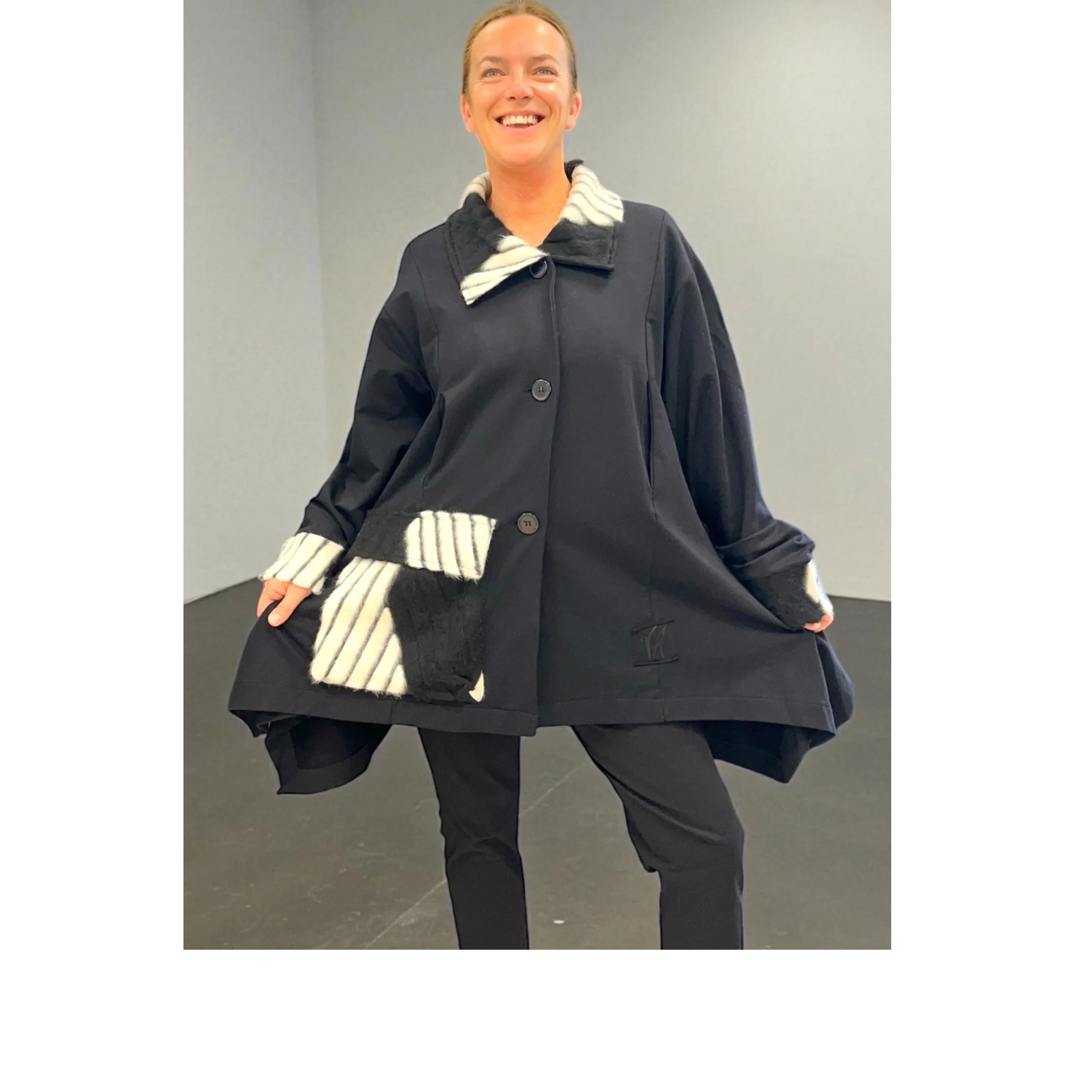 Besonders die Kombination aus schwarzem Stoff mit flauschigen weiß-schwarzen Details an Kragen, Taschen und Ärmeln verleiht ihr den gewissen Wow-Effekt.